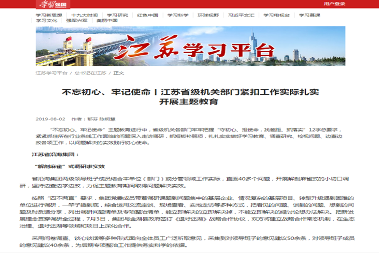 新華日?qǐng)?bào)和學(xué)習(xí)強(qiáng)國(guó)江蘇平臺(tái)對(duì)集團(tuán)黨委領(lǐng)導(dǎo)班子成員深入基層調(diào)研、廣泛聽(tīng)取意見(jiàn)、查找問(wèn)題清單、落實(shí)專(zhuān)項(xiàng)整治的主題教育成果進(jìn)行了報(bào)道,重點(diǎn)宣傳了集團(tuán)推進(jìn)退圩還湖、“生態(tài)優(yōu)先、綠色發(fā)展”的新理念。找出差距,抓好落實(shí),關(guān)系到如何守初心、擔(dān)使命,也關(guān)系到主題教育的實(shí)效。媒體報(bào)道了集團(tuán)黨委領(lǐng)導(dǎo)班子結(jié)合工作實(shí)際,直面40多個(gè)問(wèn)題,開(kāi)展解剖麻雀式的深入調(diào)研;堅(jiān)持“抓重點(diǎn)、補(bǔ)短板、強(qiáng)弱項(xiàng)”,邊查邊學(xué)邊改,力促主題教育活動(dòng)取得解決問(wèn)題實(shí)效。