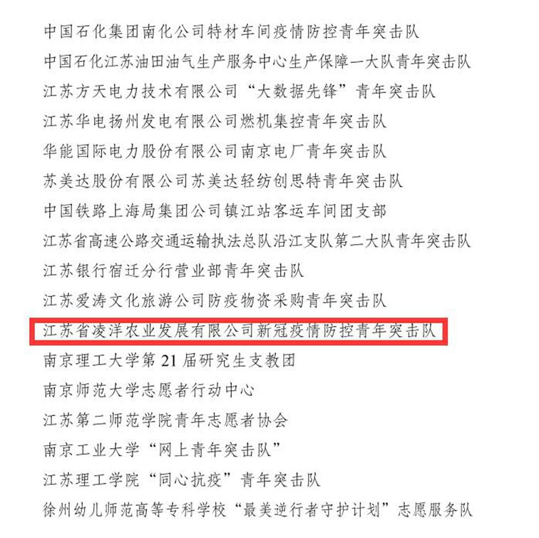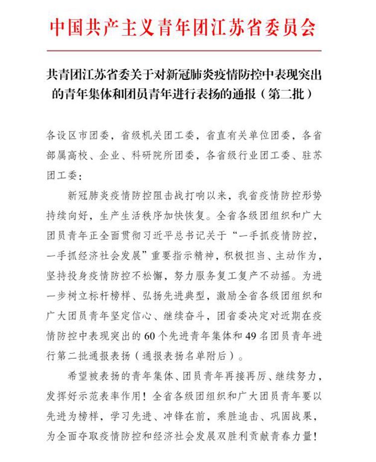 3月11日,團省委下發(fā)文件《共青團江蘇省委關于對新冠肺炎疫情防控中表現突出的青年集體和個人進行表揚的通報(第二批)》,省沿海集團凌洋公司新冠疫情防控青年突擊隊獲團省委通報表揚。