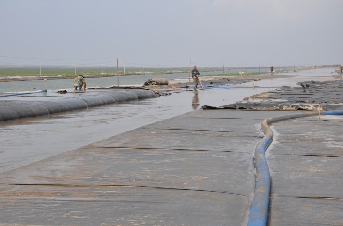 隨后,梁董事長(zhǎng)深入到條子泥一期工程全部三個(gè)標(biāo)段的施工現(xiàn)場(chǎng)進(jìn)行實(shí)地察看,詳細(xì)了解項(xiàng)目的進(jìn)展情況,從一標(biāo)段出發(fā)沿著新筑中隔堤徒步行走到二標(biāo)段,行程累計(jì)近十公里。在看到一、二標(biāo)段海堤連為一體,條南片墾區(qū)已經(jīng)完成閉合后,梁董事長(zhǎng)高興地說(shuō),條南片墾區(qū)的閉合標(biāo)志著條子泥一期工程按照施工總體進(jìn)度計(jì)劃順利完成,項(xiàng)目建設(shè)進(jìn)入了一個(gè)新的階段。下一步要采取積極有效措施,抓緊推進(jìn)二期工程的前期報(bào)批工作,使一二期工程有機(jī)銜接,全力推動(dòng)工程協(xié)調(diào)進(jìn)展。