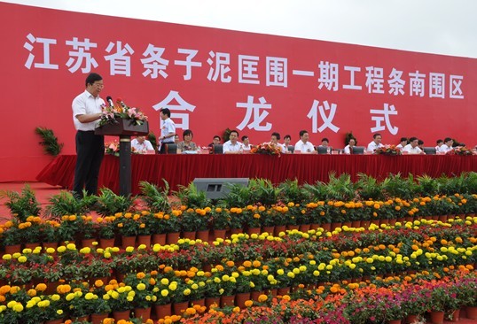 6月26日上午,條子泥匡圍一期工程條南圍區(qū)合龍儀式在工程施工現(xiàn)場(chǎng)隆重舉行。省政府副秘書長徐立,省發(fā)改委、沿海辦、財(cái)政廳、國土資源廳、環(huán)保廳、水利廳、審計(jì)廳、國資委、海洋漁業(yè)局、農(nóng)業(yè)資源開發(fā)局、能源局、交通運(yùn)輸廳港口局、電力公司等省有關(guān)部門負(fù)責(zé)同志,鹽城市、東臺(tái)市主要領(lǐng)導(dǎo)同志出席合龍儀式。