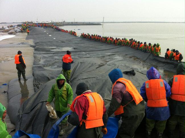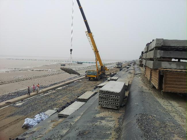 條北片匡圍面域范圍廣、圍堤長、灘面情況復(fù)雜。項(xiàng)目開工以來,為搶抓冬季灘涂圍墾的有利機(jī)遇,工程建設(shè)單位、監(jiān)理單位和施工單位一道商議方案,調(diào)配機(jī)械,增加人員,共投入施工及管理人員近1800人,大型施工機(jī)械41臺,發(fā)電設(shè)備21臺,水利沖挖施工設(shè)備142臺套,通過采用吸沙船等先進(jìn)施工設(shè)備,全力推進(jìn)工程施工進(jìn)度。目前,11.04公里隔堤已全部形成,達(dá)標(biāo)段達(dá)98%。東堤2+600至13+452位置施工斷面圍堰已施工外棱體至▽5.0以上,回填土達(dá)到▽4.0左右。截至1月底,條北片新開工項(xiàng)目共計(jì)完成軟體排鋪設(shè)74.26萬平方米,施工吹沙袋棱體土方66.23萬立方米,吹填砂48.7萬立方米。同時,通過一系列行之有效的措施,1號隔堤以南龍口于2013年1月23日成功實(shí)現(xiàn)了全部龍口截流,至此,在條南片3.33萬畝圍區(qū)之后,條北片南側(cè)又有3.6萬畝圍區(qū)實(shí)現(xiàn)滄海變桑田。此次龍口截流工程還在江蘇圍墾史上首次實(shí)現(xiàn)了三個互有影響的龍口同時在一個潮汛期內(nèi)合龍,并經(jīng)受住了農(nóng)歷十八天文大潮的沖擊。
