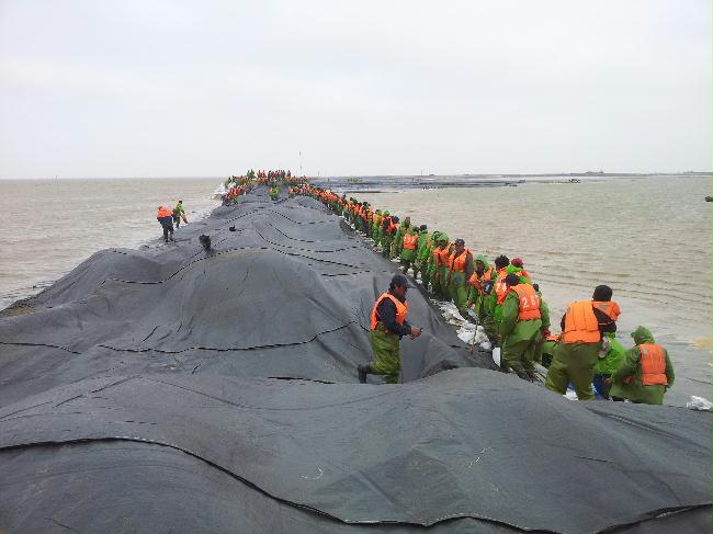 2013年4月4日,條子泥匡圍一期工程條北片圍區(qū)4#隔堤龍口順利合龍,并經(jīng)受住了大潮汛及5日寒潮大風(fēng)影響的考驗。此次龍口合龍,不僅實現(xiàn)了一期工程9.6萬畝圍區(qū)的封閉,而且部分阻斷了近岸洋流通道,為北堤灘面的穩(wěn)定及20m閘等骨干建筑物的投入使用創(chuàng)造了條件。