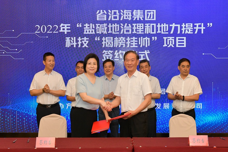 “端穩(wěn)中國糧,鹽堿地大有可為”。6月21日,集團2022年鹽堿地治理和地力提升技術集成與示范“揭榜掛帥”項目簽約儀式在南京舉行。江蘇省國資委綜合處處長高平、江蘇省科技廳農村科技處調研員謝宗華、省沿海集團總經理周金陽、項目牽頭單位代表出席簽約儀式。省沿海集團相關部門負責同志、土地公司、科技公司相關領導參加活動。