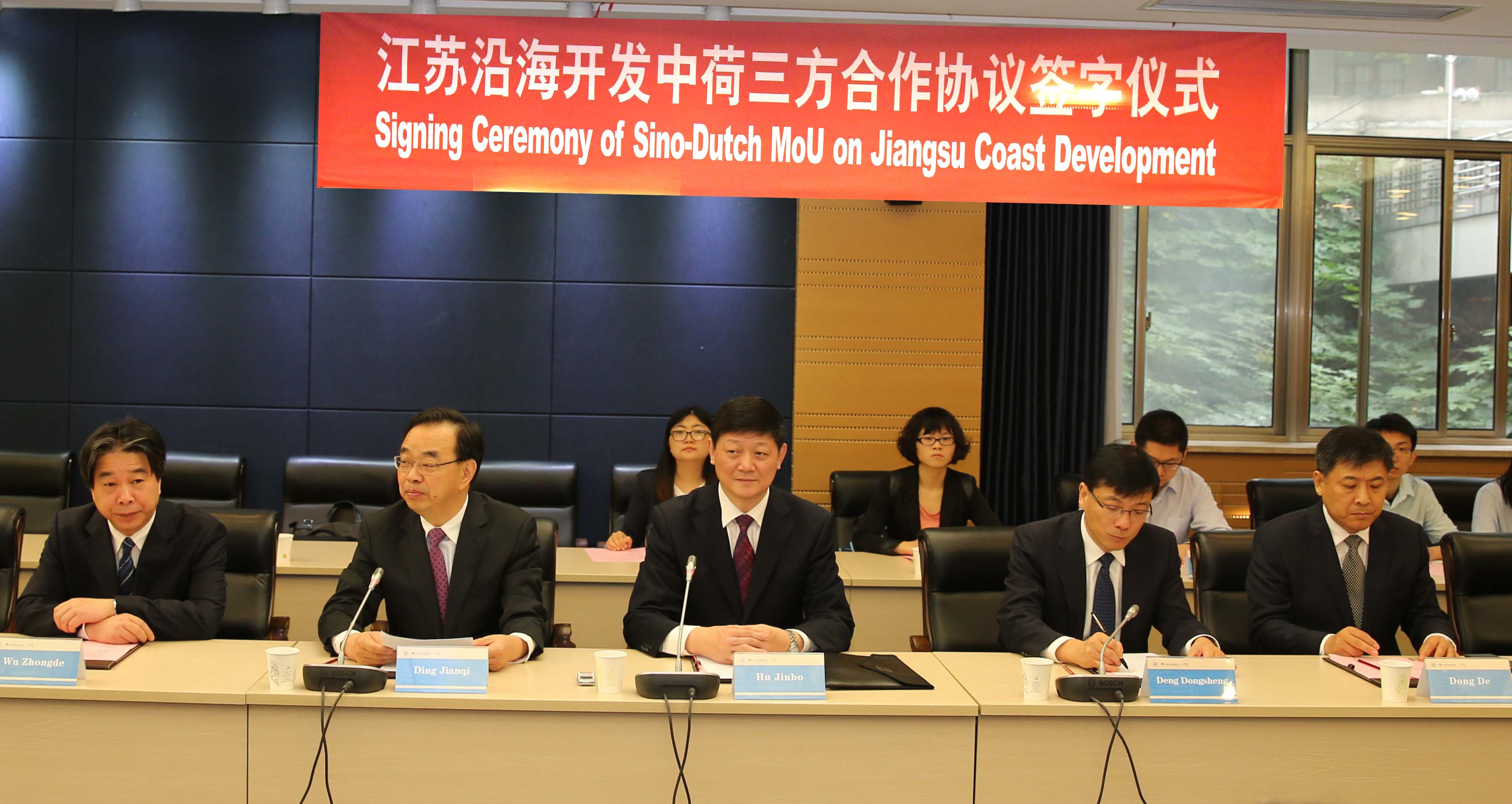 6月5日,江蘇省沿海開發(fā)集團、河海大學、荷蘭三角洲研究院在寧舉行江蘇沿海開發(fā)中荷三方合作協(xié)議簽字儀式及國際學術(shù)研討會。省委組織部副部長、省人才辦主任胡金波,荷蘭駐華大使館基礎設施和環(huán)境參贊 Anne te Velde(魏安娜)女士,集團公司董事長鄧東升,河海大學黨委書記朱拓教授,荷蘭三角洲研究院亞太區(qū)總監(jiān)Tjitte Nauta(切特 納塔)教授,省委組織部干部四處處長董德,省外事辦公室國際交流中心主任吳忠德等領導專家出席儀式。集團公司總經(jīng)理丁建奇主持儀式。