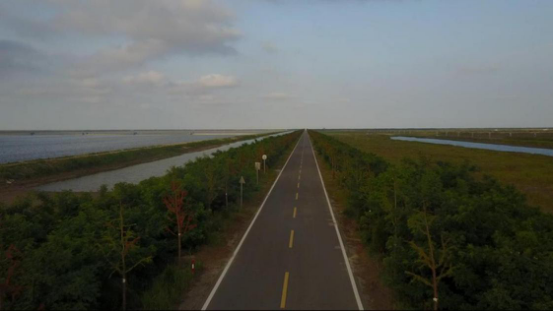 墾區(qū)在海堤施工完成后,立即進行了海堤內(nèi)坡草皮移栽和植樹工作,達到了當(dāng)年圍墾、當(dāng)年植樹、當(dāng)年成活的效果;對墾區(qū)內(nèi)道路兩側(cè)均進行了植樹種草綠化,養(yǎng)殖塘口四周、生態(tài)水庫、溝渠兩側(cè)種植狗芽根、獐茅草、田菁、蘆葦?shù)冗M行植被恢復(fù);在局部條件具備區(qū)域試種耐鹽樹種,在開發(fā)成熟時,墾區(qū)內(nèi)綠化率將達到20%以上。