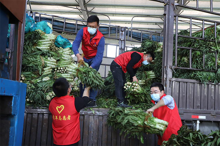 (肖旭(右一)與團(tuán)隊成員一起分揀蔬菜)