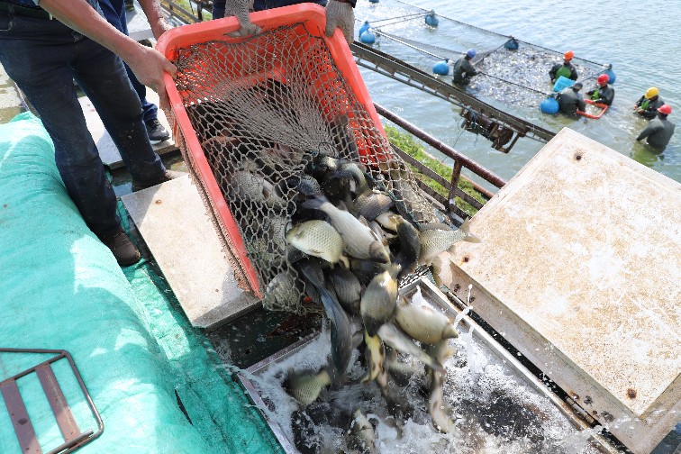 “工人們天剛亮就開始干活了,布網(wǎng)、投食、收網(wǎng),取大留小”,農(nóng)發(fā)金東臺(tái)分公司淡水養(yǎng)殖負(fù)責(zé)人王小祥介紹道。在他身后,工人們正在塘口將剛打撈上的魚過秤裝車,及時(shí)運(yùn)往省內(nèi)外市場(chǎng)。
